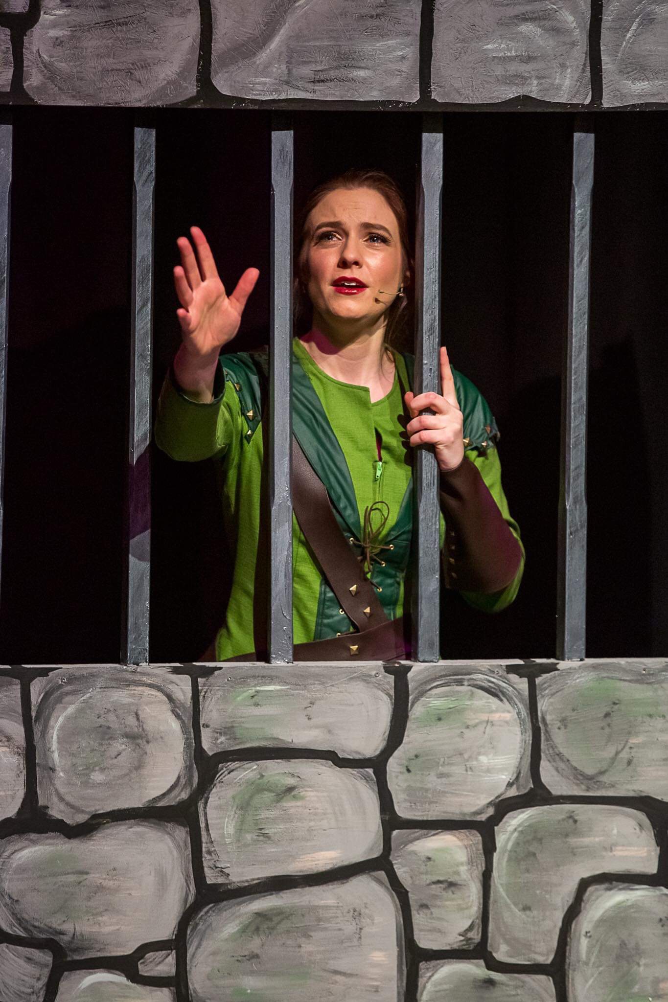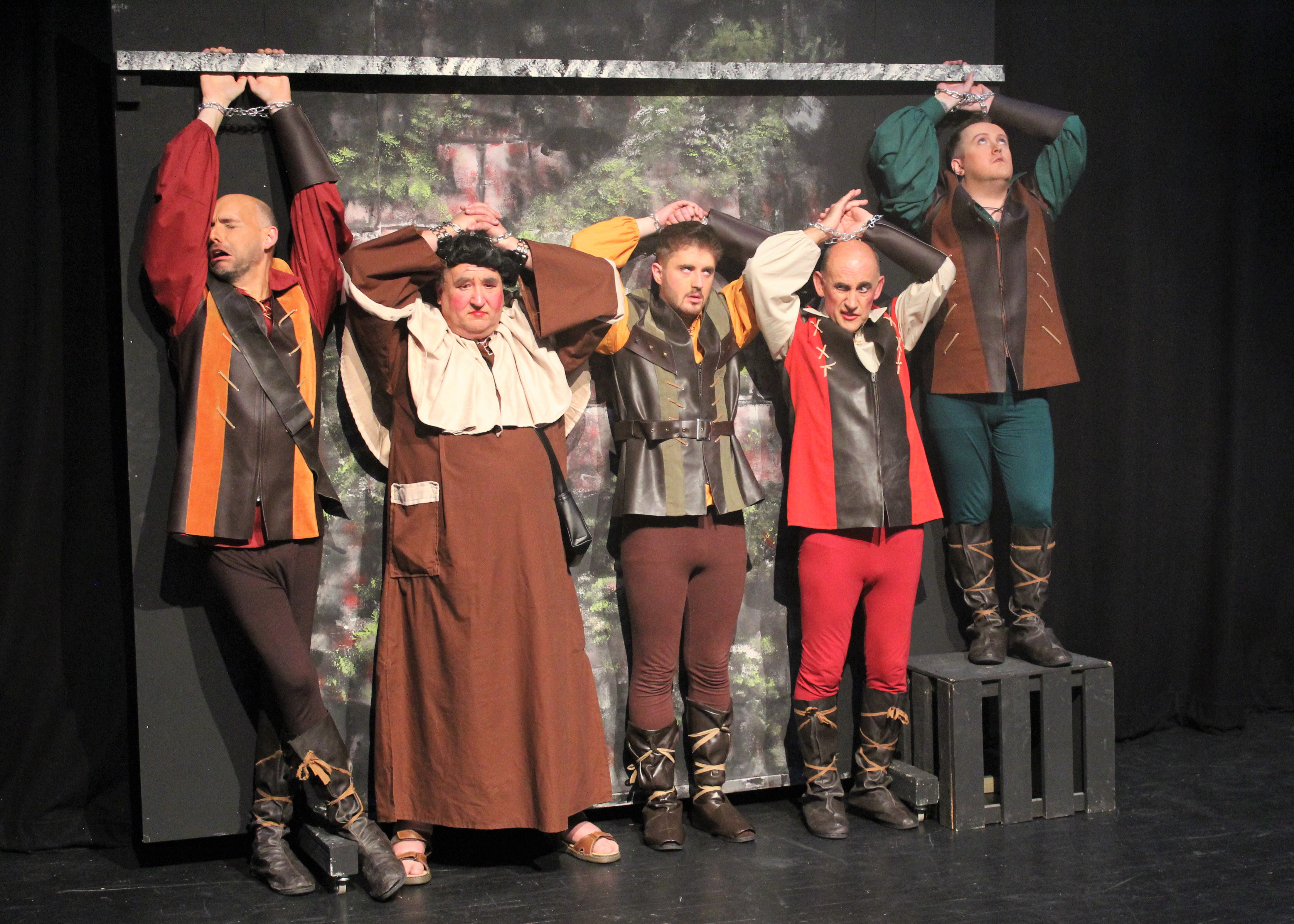 The (equally camp, it has to be said) Merry Men – Rob Jones, Ben Spurling, Tim Smith, Casey Delaboud and Rob Steel-Bingham – come into their own in a very silly – and hilarious – scene in the Sheriff’s dungeons, and give a sterling rendition of ‘Men In Tights’. Each has his own individual characterisation but they work together as a very funny team.