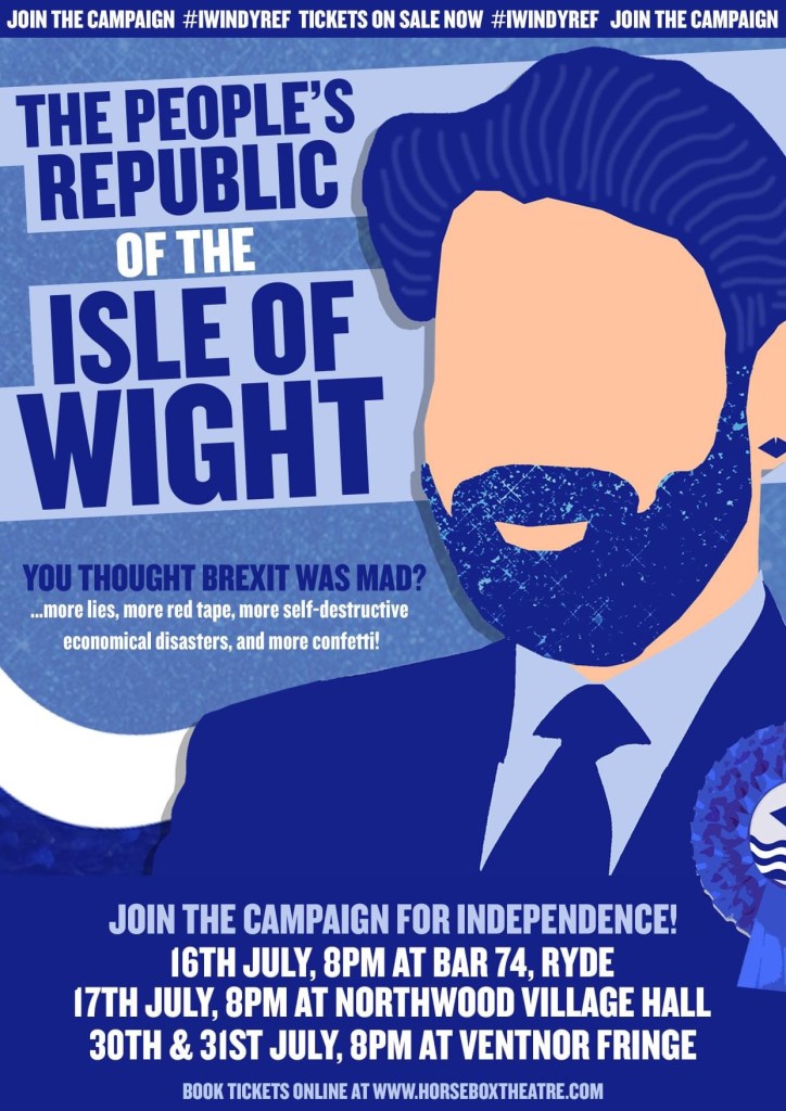 The People’s Republic of the Isle of Wight may be a difficult to remember title for a play, but the experience is anything but! In true Joe Plumb fashion, with a mix of humour, irony, sarcasm, ad lib and audience interaction, this play was so much fun! When we arrived we were given cards to write down our pet hates and loves about the island, along with some made-up slogans that we were encouraged to shout and wave at appropriate moments. (I have to say, there was something really liberating about shouting and waving a card passionately in the air, perhaps as a result of being in lockdown for so long.)