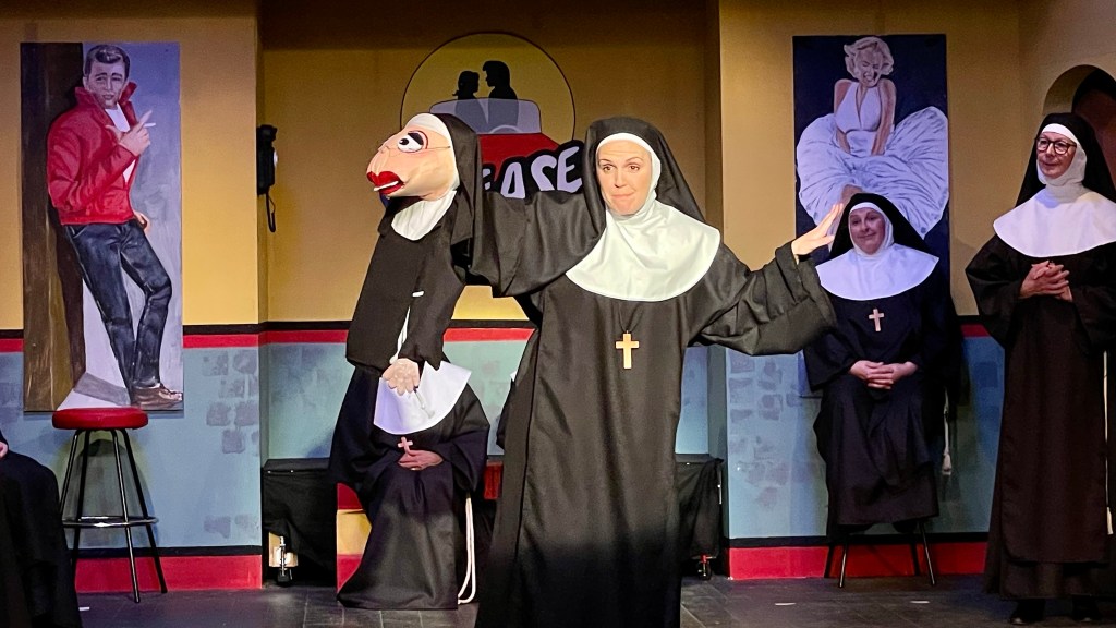 There must be something in the water on the most easterly side of the Island as the singing standard was pleasantly high. Bryony Bishop’s range in the song “So You Want to be a Nun” was strong, bouncing effortlessly between a choir singer’s soprano and the comedic deeper tones of her duet partner, her hand (it must be noted here that this song was sung between Sister Robert Anne and a puppet.) One must also mention here another strong voice, albeit the absence of it. Rob Bingham unfortunately was unable to perform for the entire run of the show, being struck down with COVID-19 days before the opening night. Luckily the cast pulled together and covered brilliantly. His songs were picked up by John and Hanna and had it not been for Rob’s name next to them in the programme, there was no way to tell that anything had changed. Both performers knew the songs and choreography perfectly, I imagine a couple of extra rehearsals with the Musical Director, Stephen Burton, and Choreographer, Ruth Anderson, were called just to shore things up. Rob’s physical gap in the show was plugged by the director Andrew Wilson-Jenner with a small note slipped into each programme to tell us that “the role of Sister Mary Sunshine (Rob) would be played by Sister Mary Scary (Andrew).”