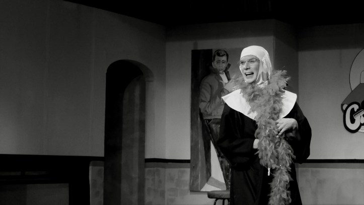 As text material goes, I’ll admit I’m not a fan, but… Luckily the BLTC kept me interested, smiling and laughing throughout the show. The characterisation of all the performers was effortless, you could see that each member of the cast was loving the production. Particular note goes to Sister Mary Amnesia, played by Hanna Emily Nixon, and Sister Mary Leo, played by John Abraham. Their well-rounded performances kept us all in good spirits and the underlying subplot of the actual identity of Sister Mary Amnesia came to a beautiful reveal at the end. Another highlight of talent was the pre-interval debacle involving the Reverend Mother, Libby Pike, and a suspicious smelling container, which was joyous to watch. Libby’s movements and contagious laughter didn’t feel forced or fake, something so easy to slip into when acting drunk or, as in this case, high. The casting choice of Sister Mary Hubert, Jane Robert, was beautiful as a company to Libby, with the two riffing off each other and Jane’s stature allowing for some very funny moments.