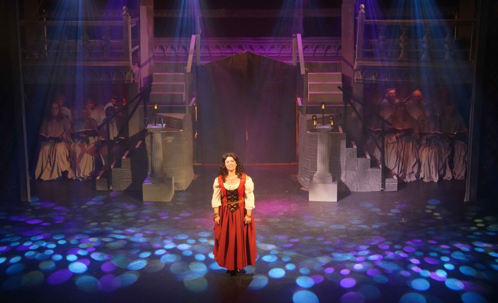 Captain Phoebus De Martin is sent by Frollo to track down Esmeralda, but he too falls under her spell. Brad Barnley delivers on the portrayal of Pheobus as both a (Prince) charming and strong soldier, who defies Frollo, preferring to be compassionate and righteous. Brad’s stage presence is strong, his booming voice always finding the sweet spot in the auditorium. Bravo.