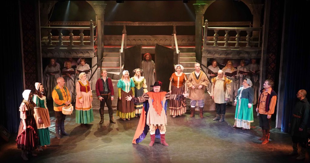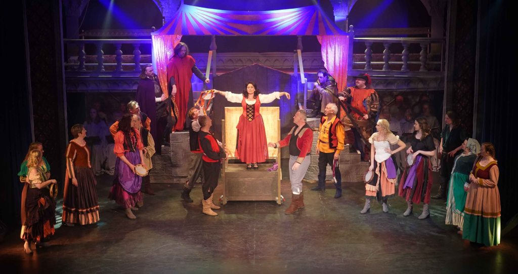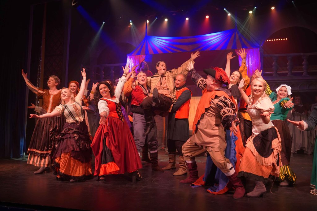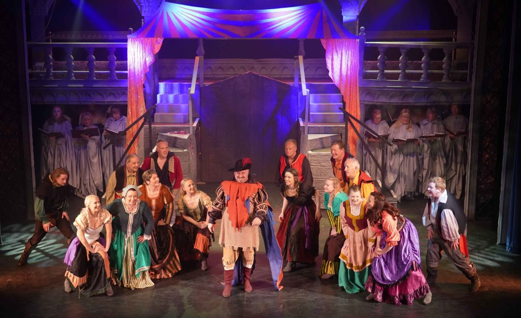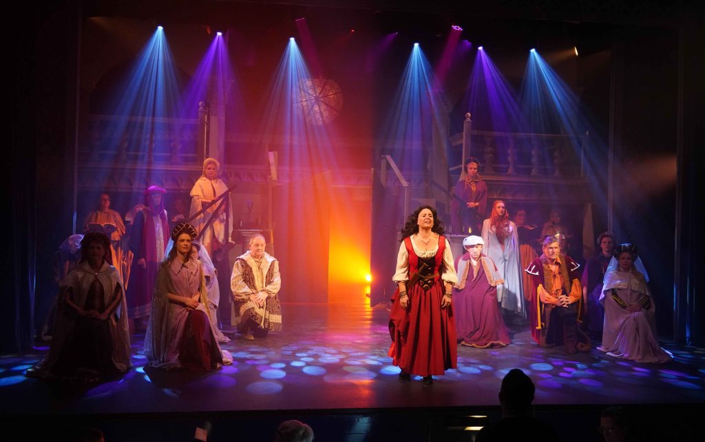 The real strength though in this production is the teamwork that is on display. The principal’s performances are enhanced further by the Congregation (the ensemble) and the Choir. The Choir are always on stage, they may be physically placed in the background, but their presence is felt all around the theatre. Latin liturgy never sounded so good. The Congregation are probably the busiest of all. They are virtually on stage throughout, only going off to change in and out of costume. Playing the Gypsies, gargoyles, soldiers and Parisians, not only dancing, but also delivering spoken and sung lines intricately woven throughout the whole production. Some individual shout out to members who were awarded specific roles… The charismatic performance from Edward Nash as Jehan Frollo – we need to see more Ed on our Island stages; the voice of Emily Scotcher as Florika in the finale; and the hauntingly beautiful solo stanza from Friederike Skeet in the Choir. It takes skill, rehearsal and commitment to be part of this team.
