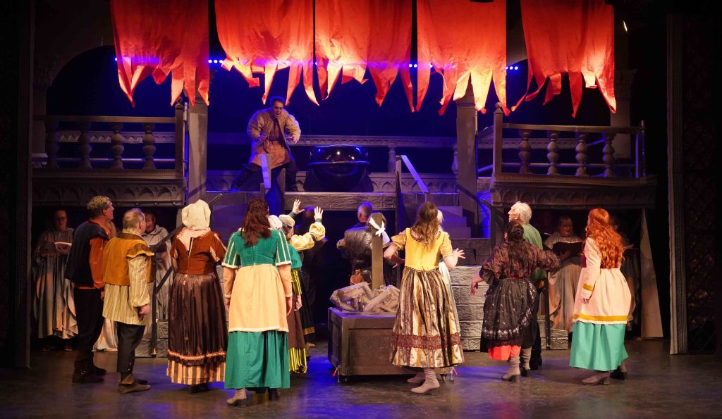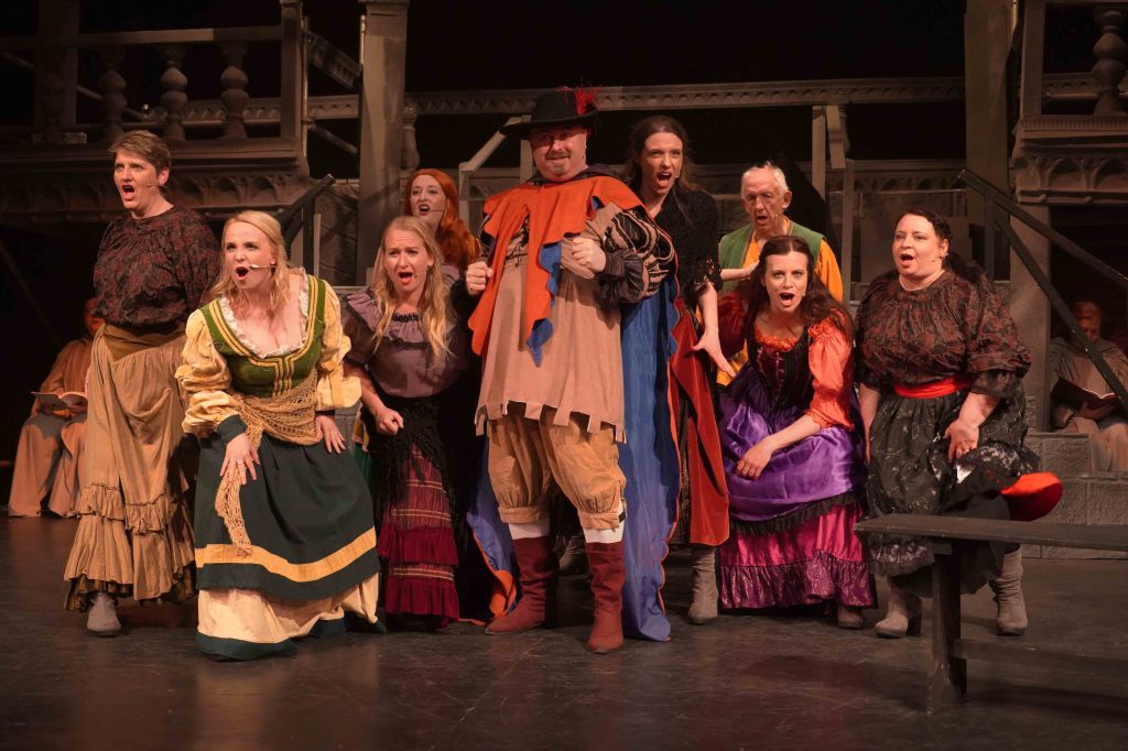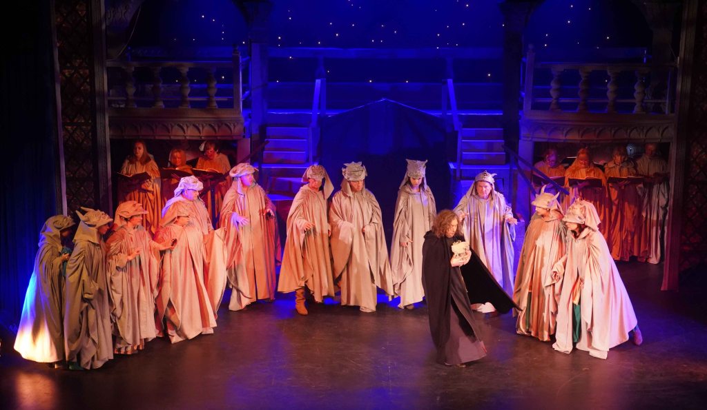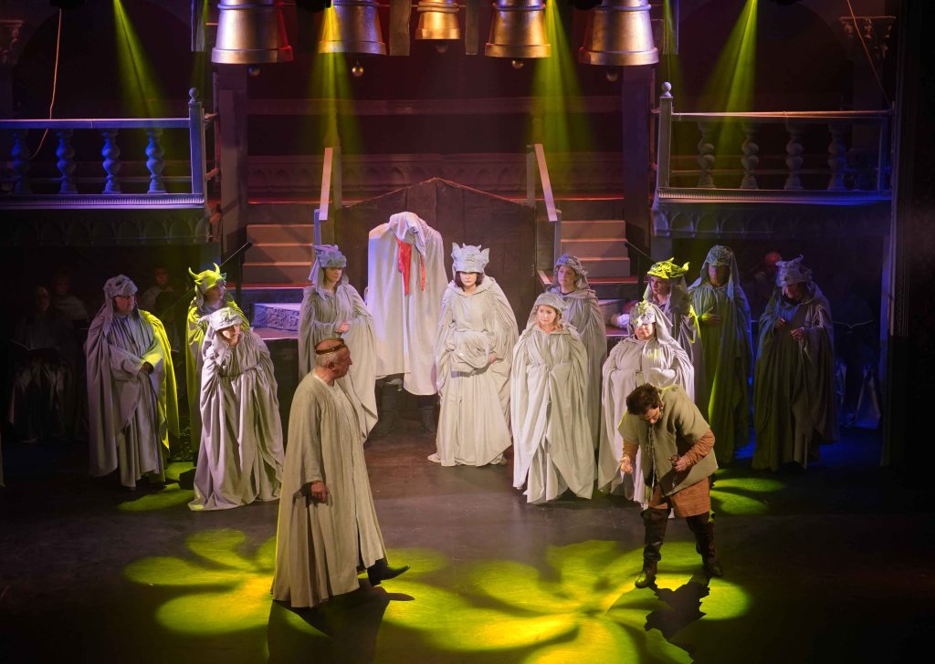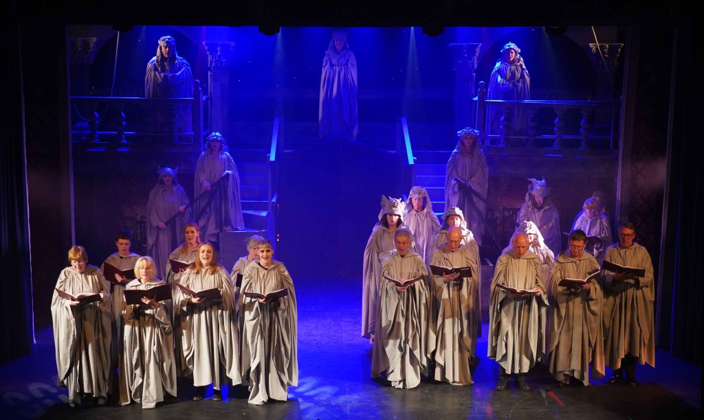 The real strength though in this production is the teamwork that is on display. The principal’s performances are enhanced further by the Congregation (the ensemble) and the Choir. The Choir are always on stage, they may be physically placed in the background, but their presence is felt all around the theatre. Latin liturgy never sounded so good. The Congregation are probably the busiest of all. They are virtually on stage throughout, only going off to change in and out of costume. Playing the Gypsies, gargoyles, soldiers and Parisians, not only dancing, but also delivering spoken and sung lines intricately woven throughout the whole production. Some individual shout out to members who were awarded specific roles… The charismatic performance from Edward Nash as Jehan Frollo – we need to see more Ed on our Island stages; the voice of Emily Scotcher as Florika in the finale; and the hauntingly beautiful solo stanza from Friederike Skeet in the Choir. It takes skill, rehearsal and commitment to be part of this team.