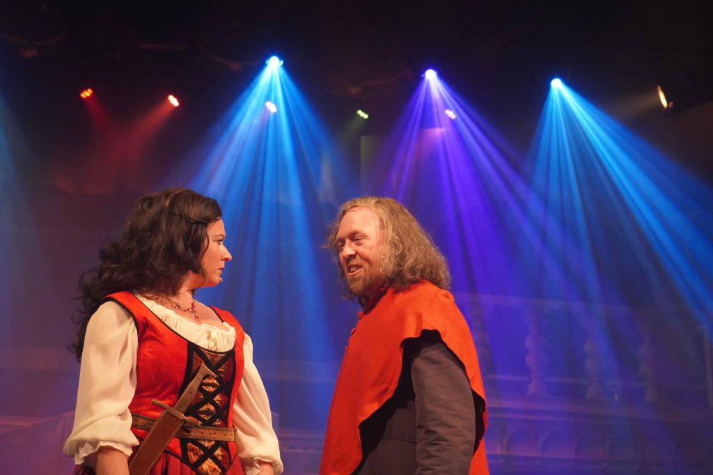 Dom Claude Frollo, the antagonist of the piece, is sinisterly played by Steve Jones. Anyone looking for a lesson on how to act through song should look no further than his performance of ‘Hellfire’. His venomous distain for the Gypsy population and his lusting for the feisty Esmeralda, clear for all to see, and hear; the timbre of his voice is chilling.