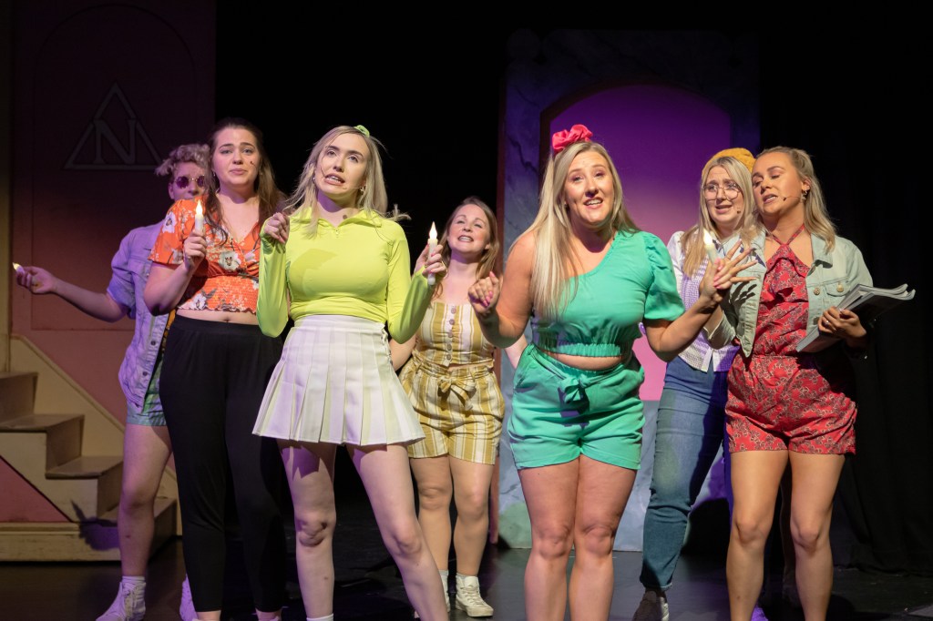 But fun, music and dancing is there in spades too: the core team are impressive, whether as sorority girls, cheerleaders, a workout video group, a Greek chorus or a band of Irish dancers – they never miss a beat singing or dancing.