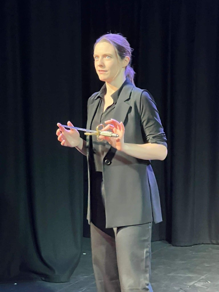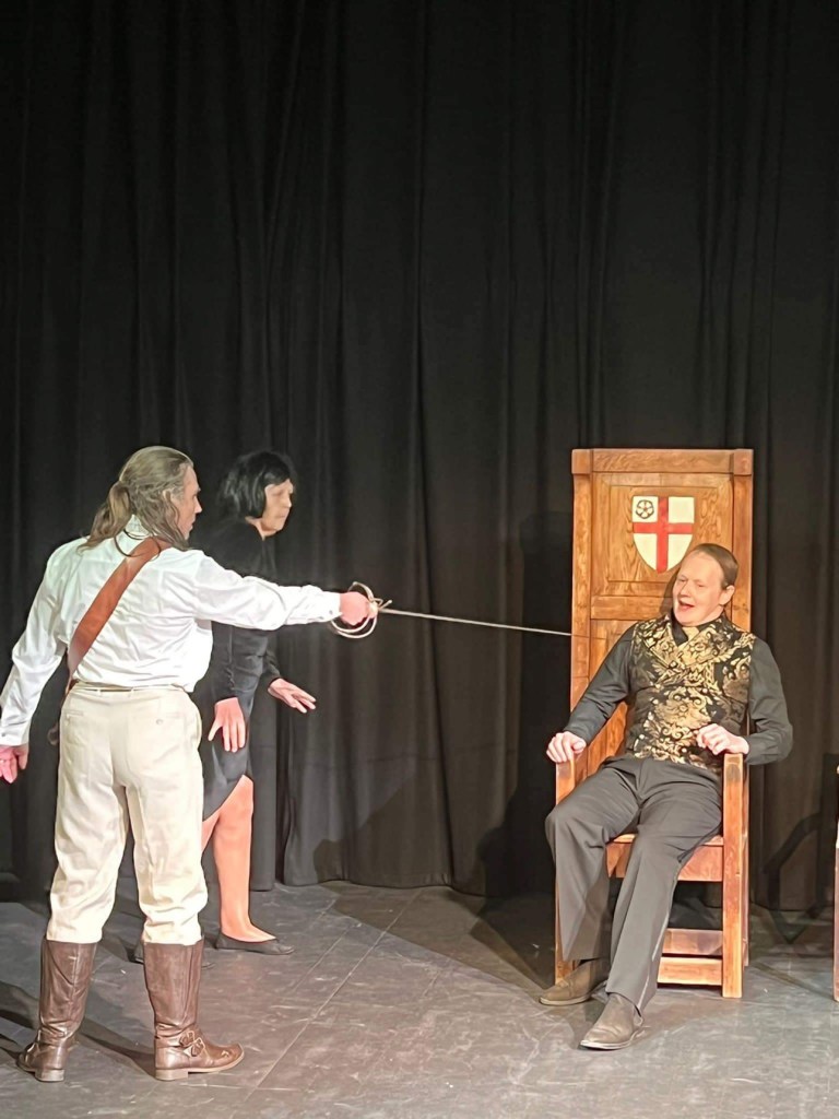 The performances of Ophelia and Laertes were also superb, emphasising sibling love to only break it down later in the narrative, profoundly impacting on the audience. To see Ophelia’s character developed in an evocative and devoted manner was both harrowing and impressive. It is also impossible to ignore the sword-fighting skills of Laertes and Hamlet- one of my personal favourite moments of the play as an avid fan of fantasy! The dimensionality of Claudius, his secret of murder and its gradual unravel was performed effectively throughout, especially within his own soliloquy and the character development of Gertrude from blind loyalty to realisation against Claudius was superbly communicated.