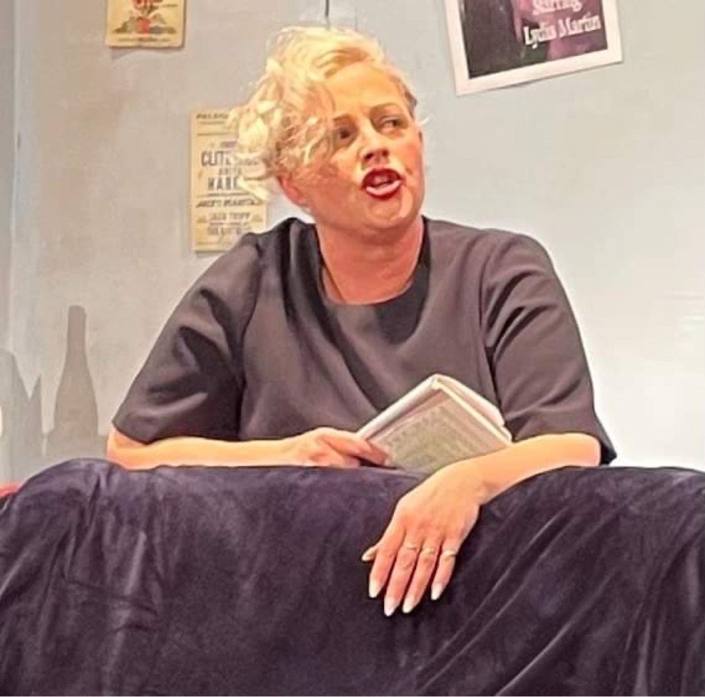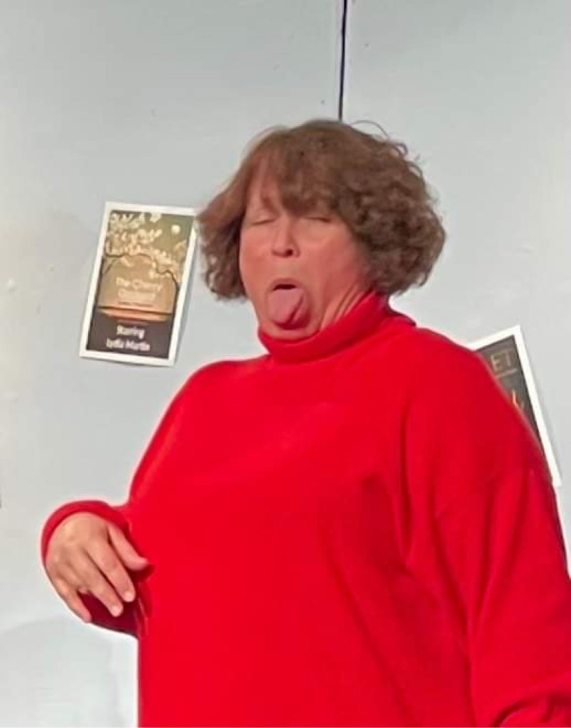 Martie Cain takes on the role of Lydia’s agent Harriet, who arrives with a bottle of (cheap) brandy…and things go downhill from there. Like Olivia, Martie has great experience as a comedy actress, and the spontaneous round of applause at her exit in Act 2 is testament to her skills.