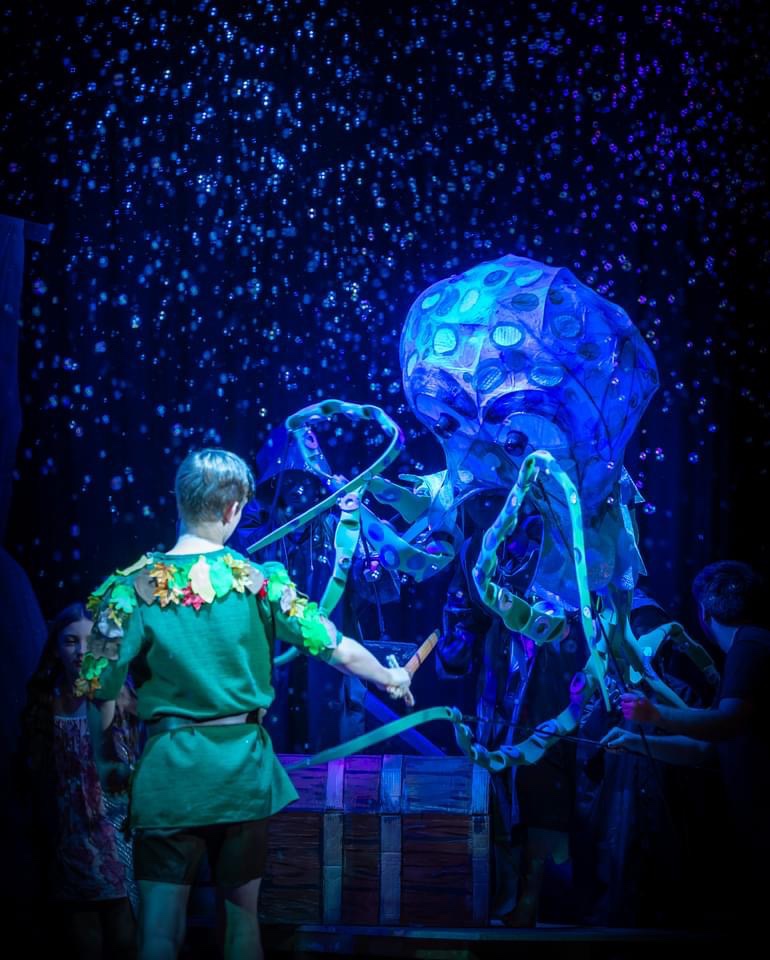 We accompany Pan, Eva and Wren on their journey in Neverland and meet a large group of hilarious pirates led by Black Nell (Jess Rockhill with complete authority, and a wet fish) followed by the carefree Lost Boys, scrambling all over the stage. There are even charming mermaids to admire and an assured Tiger Lily (played with gumption by Cheyenne Horne). But it’s the set, props and lighting that steal the show with a beautiful flying sequence, fantastic underwater octopus fight scene and an enormous, hungry crocodile!