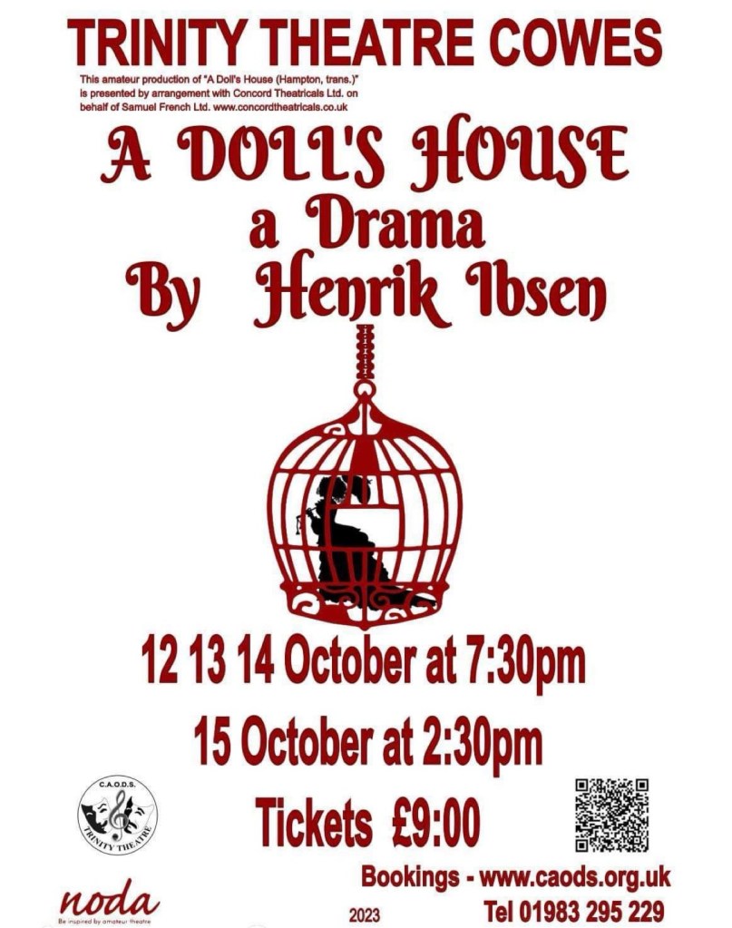 Supporting cast include family friend Dr Rank, played by Martin Stanley who depicts the old man’s physical frailty well, and nursemaid Anne-Marie, a delightful cameo by Carolyn Ferguson. Unlike most productions of A Doll’s House’ this one does not bring Nora’s children on to the stage, but nothing is lost by this: the point is made, as Nora says towards the end of the play, that she has been treated as a doll, a plaything, by her father and then ‘given to’ her husband who treats her in the same way. The birdcage opening at the end is pleasingly symbolic, and the play gives us much to think about, reflecting that what was the norm 150 years ago would now be rightly regarded as an abusive marriage.