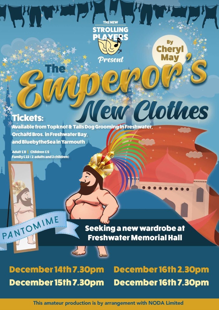 The award winning New Strolling Players recently finished their run of “The Emperor’s New Clothes” by local playwright Cheryl May. It was with some intrigue and excitement I went to their evening showing on the 16th of December. How would this panto go? Was there enough plot in place for the great reveal (if you pardon the pun) at the end?