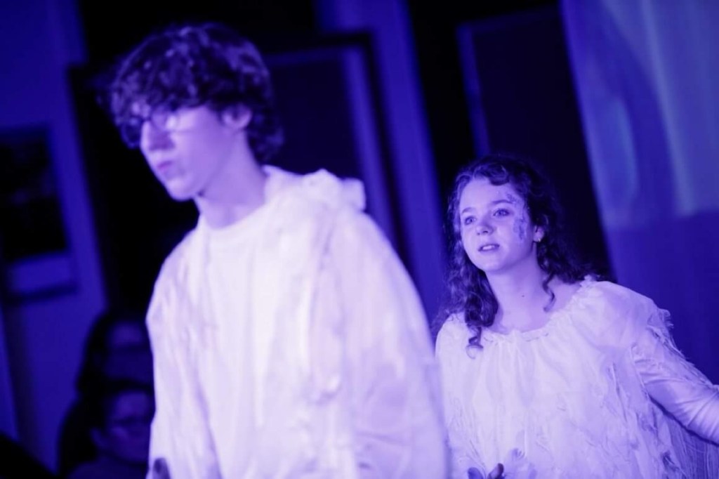 This production chose to portray Ariel as four different spirits that explore the magic of the Island, this was a nice touch which gave an ethereal feel to the performance. Emily B-M, Emma H, Tallulah M and Maia T worked well together to create an elegant, airy and delicate Ariel, and had moments of great movement which, when added to their flowy costumes, created a slight breeze as they entered and exited the space, which made the hairs on the back of my neck stand up on end and felt all encompassing, a really nice effect, especially for those sat by the entrances.