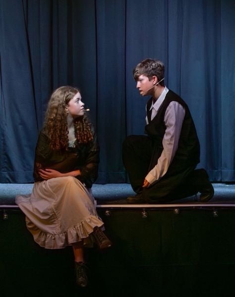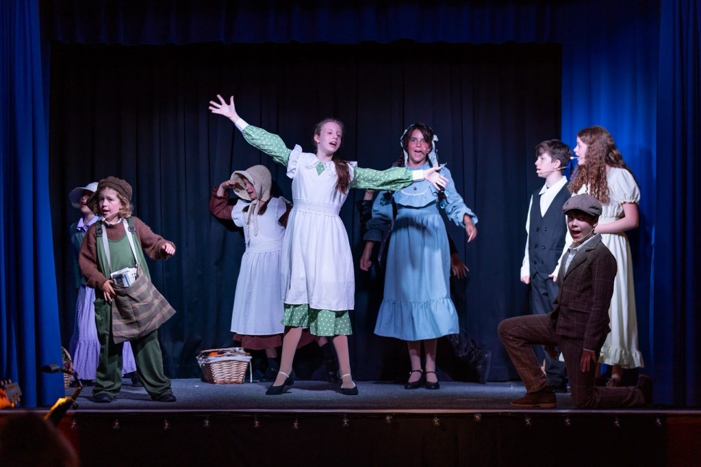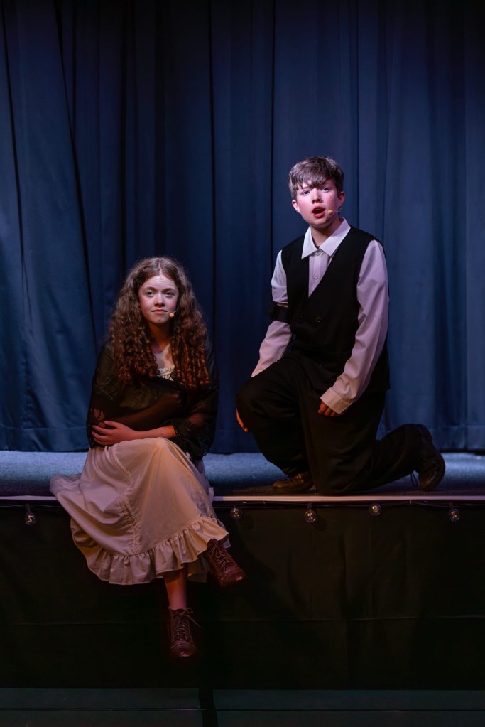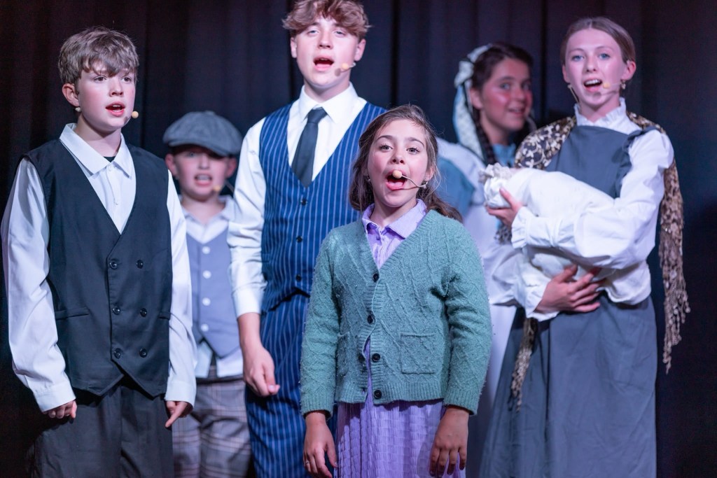 The three main roles however, taken by older cast members – though still in their mid-teens – were perfectly portrayed, with the three-way love triangle and onstage chemistry as good or better than most adult productions. George Sales showed his versatility by taking both the role of George Gaunt, the self-proclaimed ‘bad’ and grasping landlord who threatens to throw the struggling Babington family on to the streets, and the gentle, kind-hearted Will Connell, who loves Daisy with all his heart. As an aside, George, Ozzy and Connie show their singing and comedy talents in a couple of variety numbers which are a real highlight and had me in stitches!