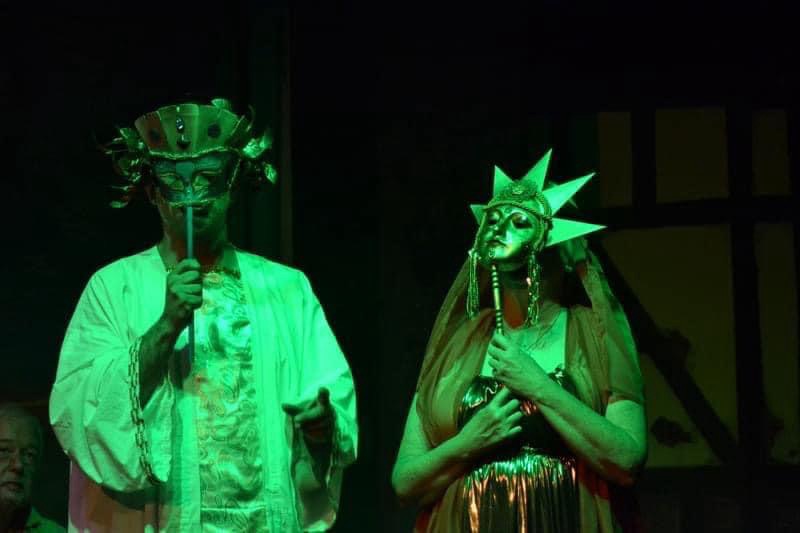 Some splendidly over the top acting in places contributed to the fun atmosphere: notably Joel Leverton leaping across the stage in about three bounds as an amorous lover (Joel’s reactions to the situations his characters found themselves in quickly resulted in laughter as soon as he stepped on to the stage!); Philip Barker’s cartwheeling arms as he explained to his love how much he adored her; Amanda Gregory’s wonderful reactions as she was wooed away from her husband – and then tried to get out of the pact she had made; Ruby Beaman’s fabulous facial expressions as she endured the amorous attentions of her old husband – Steve Taverner’s leering, grinning, lechery as the husband was a delight; and Karl Whitmore’s brilliantly funny portrayals of a god, a sinister magician and…a cockerel.