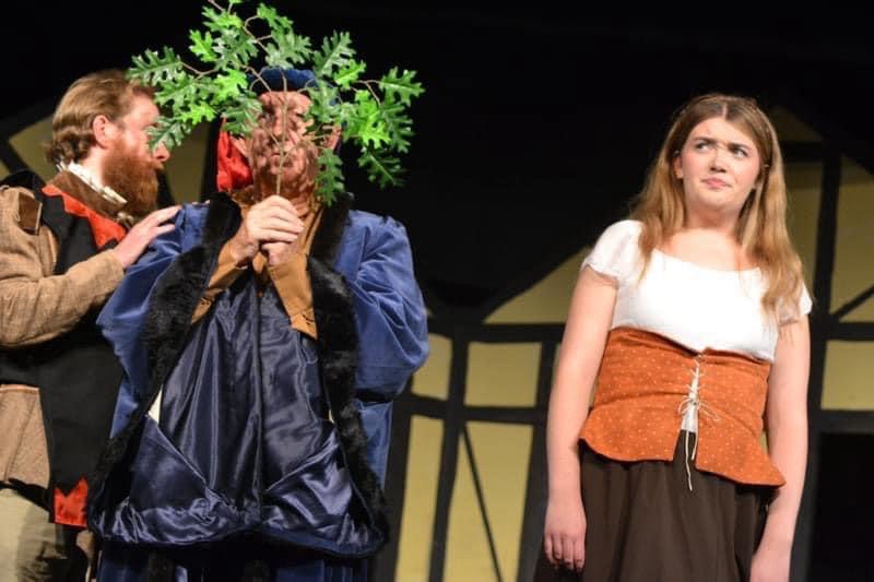 Yet there is nothing here that could cause offence. Yes, a child might ask what those two are supposed to be doing up a tree… but an age guidance on the publicity covers that. And all the naughtiness is far more silly than steamy, thanks to the imaginative direction. Indeed, the whole intention of the show, like the original tales, is to entertain and have fun. And fun there certainly is in abundance: the original tales hold their own for humour 600 years after they were written, because they deal with human frailty – and idiocy – and often the lusts of young men – and women. Extra humour is added in the panto-style presentation, with wooden hobby horses masquerading as knights’ steeds, and an actor holding a small branch indicating he is in a tree – or indeed is a tree!