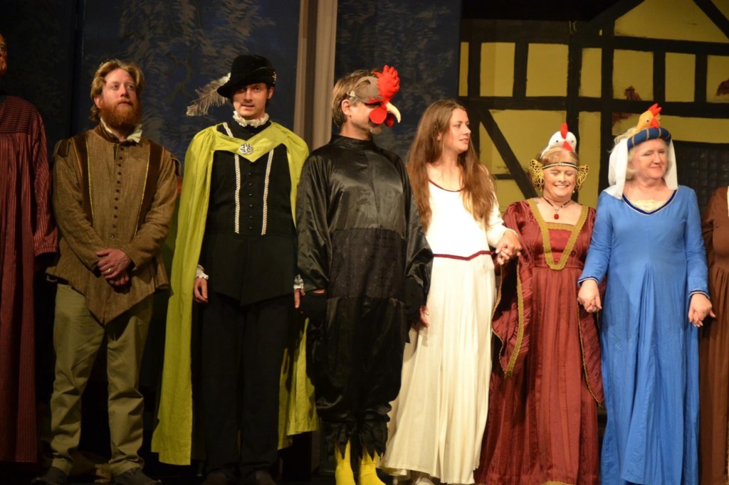 Yes, you read that right – and the tale of Chanticleer and Pertelote was one of the highlights of the show, including a song performed by Karl and his ‘hens’ – Amanda Gregory, Anne Walpole, Carolyn Ferguson and Claire Fussell – all of whom pecked and clucked their way through the scene perfectly. Joel Leverton’s turn as the evil fox was amazing too! But the overriding impression was of teamwork – when not actually involved in the story, the cast became pilgrims happy to watch the tale, heckle and drink the landlord’s ale, providing a realistic background.