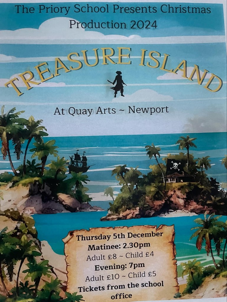 The Antony Minghella Theatre at Quay Arts is an atmospheric space, open to a huge variety of uses – and the pupils of The Priory School used it to advantage in their school production of ‘Treasure Island’. But this wasn’t just a stage version of the RL Stevenson classic – it had elements of a full stage musical, a comedy – and lots of pantomime tropes, appropriately for the time of year. The script was written by Mr Fry; who directed alongside Mr Lynch and costumes and make up were courtesy of Mr and Mrs Tate and Mrs Brennan, but essentially this was a pupil-led production, with young lighting technicians, backstage crew and front of house staff. These jobs are just as important as the onstage work and it’s great to see pupils involving themselves in all aspects of the production.