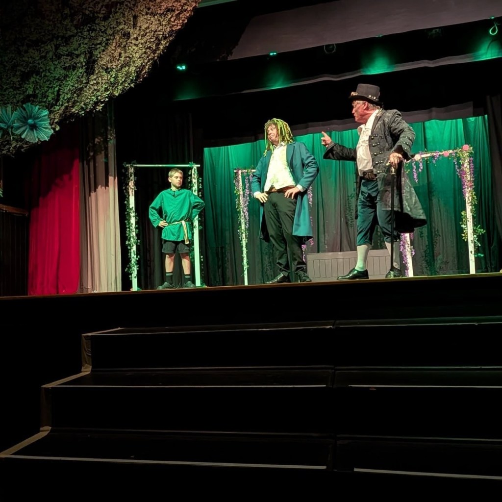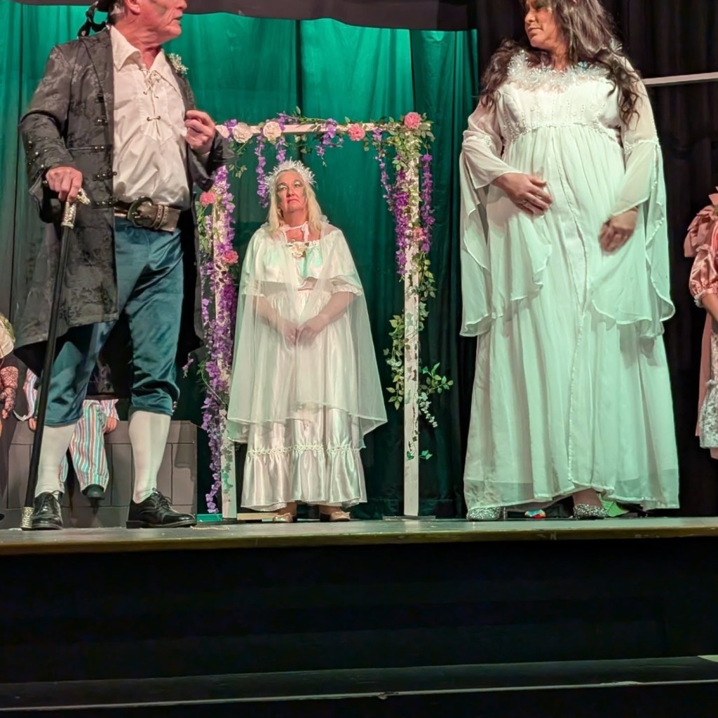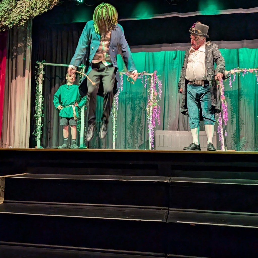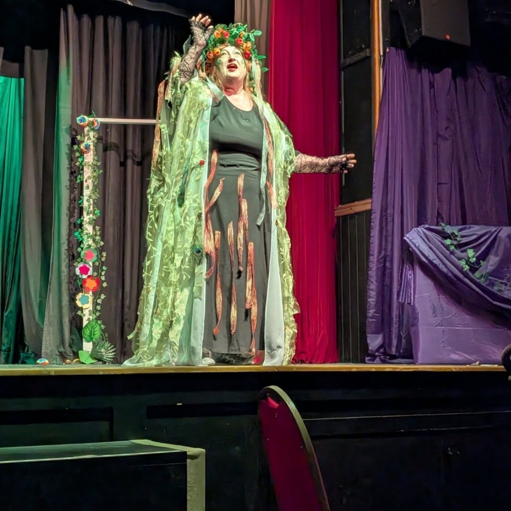 Oberon and Titania were in the capable hands of Steve Taverner and Sarah Kellett. Both were ably assisted by the standout Puck, played with energy and klutziness by Tom Worsley and a green long wig giving Wurzel Gummage energy. Martyn Stanley as Theseus gave a commanding performance alongside his onstage wife Hippolyta played by Carolyn Ferguson.