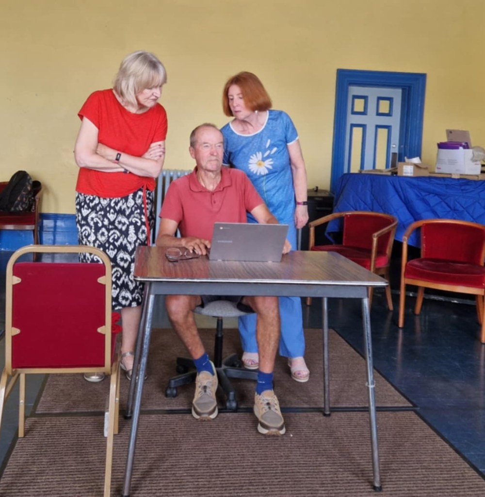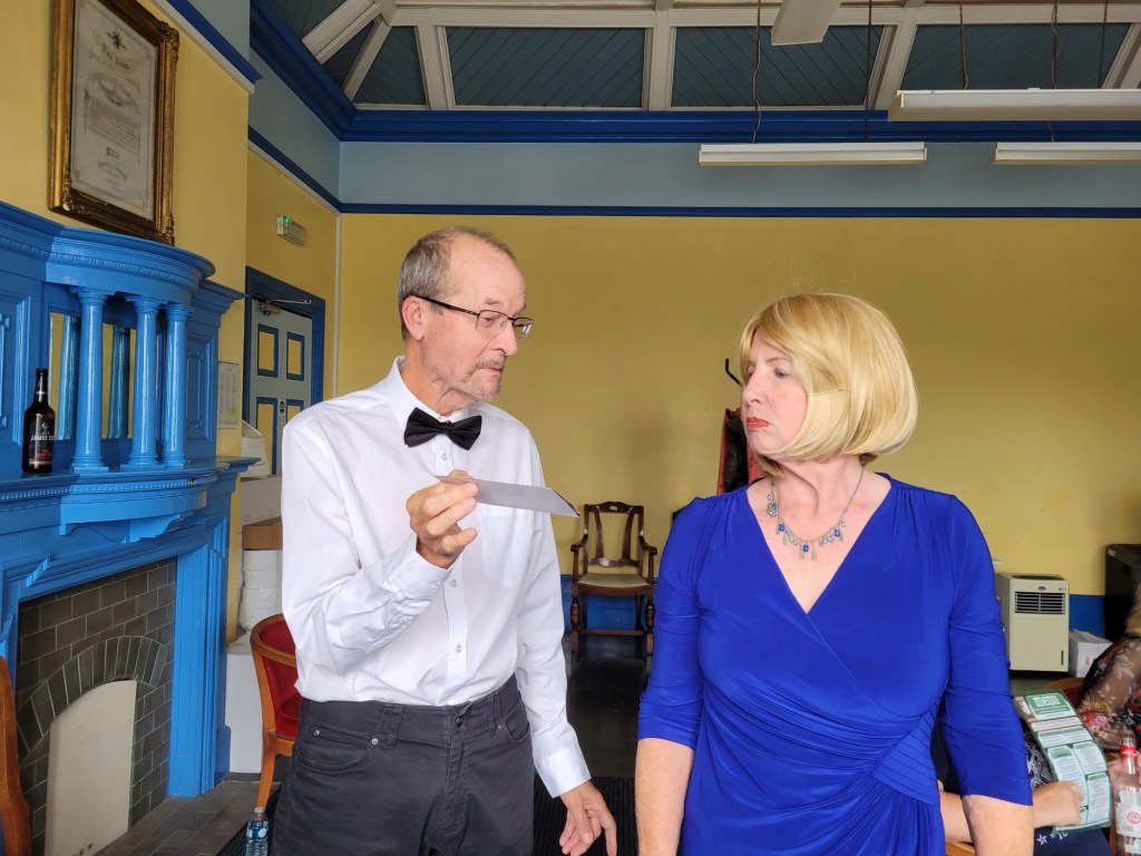 The first play, ‘Dirty Business’ introduced us to two cleaning ladies, Angela and Josie, who are facing the possibility of redundancy after council cuts have been announced. Chrissie Blow was hilarious as Josie, finding piece after piece of apparent evidence of the philandering of Roger Beasley, whose office they cleaned. Chris Turvey as Angela provided a no-nonsense foil to her more ebullient partner, but the ladies’ joy is equal when they decide they have enough information to blackmail Roger into keeping them on. We then meet Roger himself, played by Kevin Wilson with aplomb, but as he begins to clarify the real circumstances of the discarded photo in the bin and its message, we wonder whether the girls are on the right track… an unexpected injury however plays into their hands – all they have to do is get Roger to sign letters demanding they keep their jobs and all will be well. The outcome is not what we have been led to expect – a nice twist in the tale.