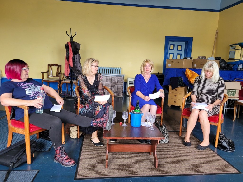 After the interval we settled back down to enjoy ‘White Lies’. Kevin Wilson reappeared, this time as a put-upon waiter, supporting the main cast of four ladies: university friends meeting up for the first time in 30 years. The play is not a good advertisement for reuniting with past friends, but provided laughs as we met Bea, whose life plan since youth appears to have been to acquire money in any way possible. Chris Turvey’s performance as Bea contrasted well with her character in the first play: Bea is insufferable, and quickly irritates her former university mates as she ridicules Ruth’s university boyfriend – Julie Stonestreet as Ruth relishes her reply: ‘We celebrated our 25th wedding anniversary last year’. The anxious Judith, played engagingly by Lorna Wilson, is devastated to discover that the love of her life who committed suicide had also been among Bea’s romantic conquests, while Bea is shocked and disgusted to find out that her friend Pam has spent time in jail. Pam – a lovely comic turn by Jenny Manning – is unrepentant and can’t quite remember being as close to Bea as the latter claims….. so when the chance arises to play a practical joke on Bea, the rest of the girls agree to take it – after all, what could go wrong? Plenty, as the denouement shows.