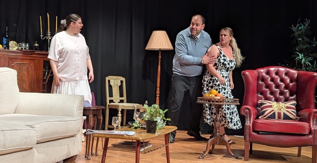The result is lots of laughter for the audience and the chance to create some hilarious characters for the cast. Michael Dangerfield made a great Tim, portraying his love for Ginnie, his desperation for the money and his increasing stress as events overtake him. Andrea Reid’s Ginnie was sweet and lovely – I can see why Tim married her – and Andrea beautifully captured the character’s innocence and distress as she pretended to be the maid so she could keep an eye on her husband – but didn’t always like what she saw!
