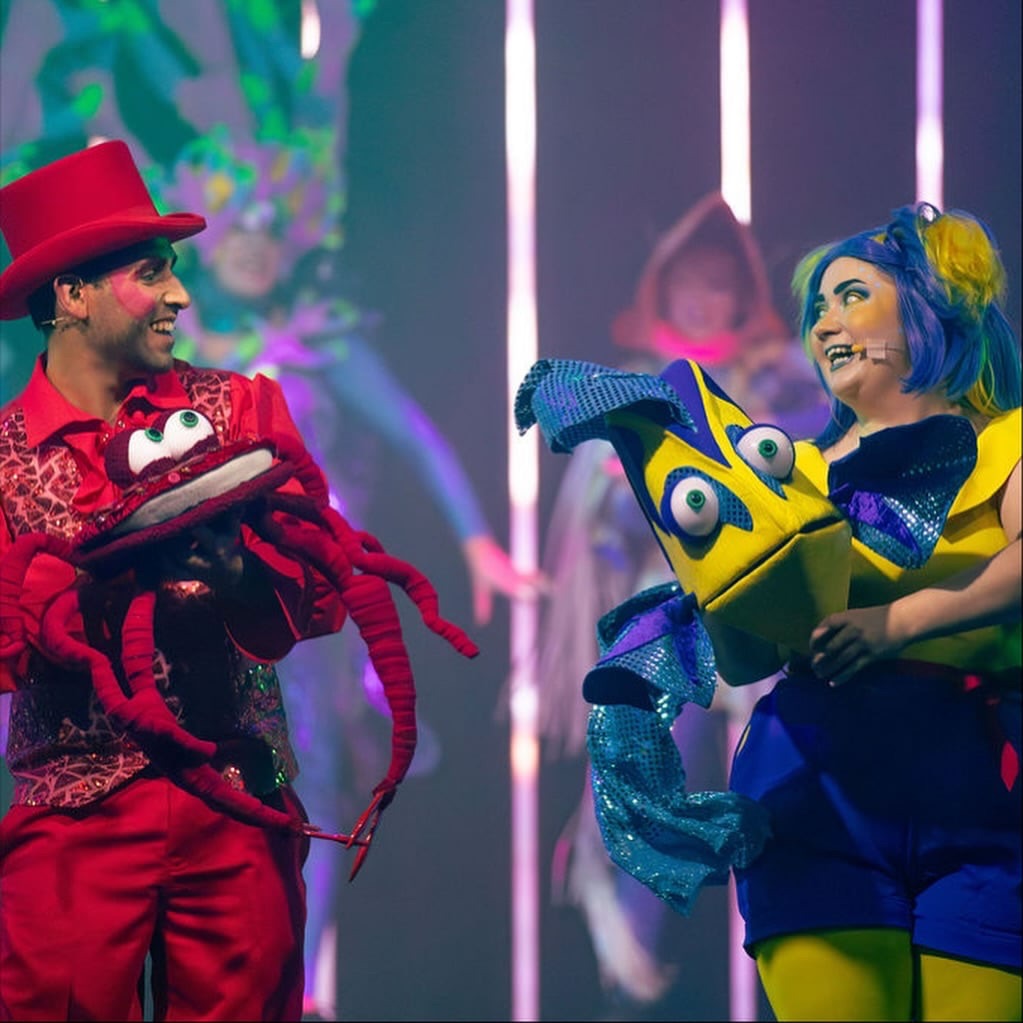 Holly was every inch the sea witch Ursula. Holly was able to dig deep, or did she, to channel the dark and disturbing essence of her character while remaining loveable at the same time. That is pure talent! Her aerial work was great and she seemed to be in her element while being suspended many feet in the air, above the stage. ‘Poor Unfortunate Souls’ was a spellbinding performance and one that will be incredibly difficult to forget. Holly was supported by Katherine Burton & Livie-Mai as the troublesome pair Flotsam & Jestsam. They added great support to Holly and delivered carnage under the waves in a very entertaining way.