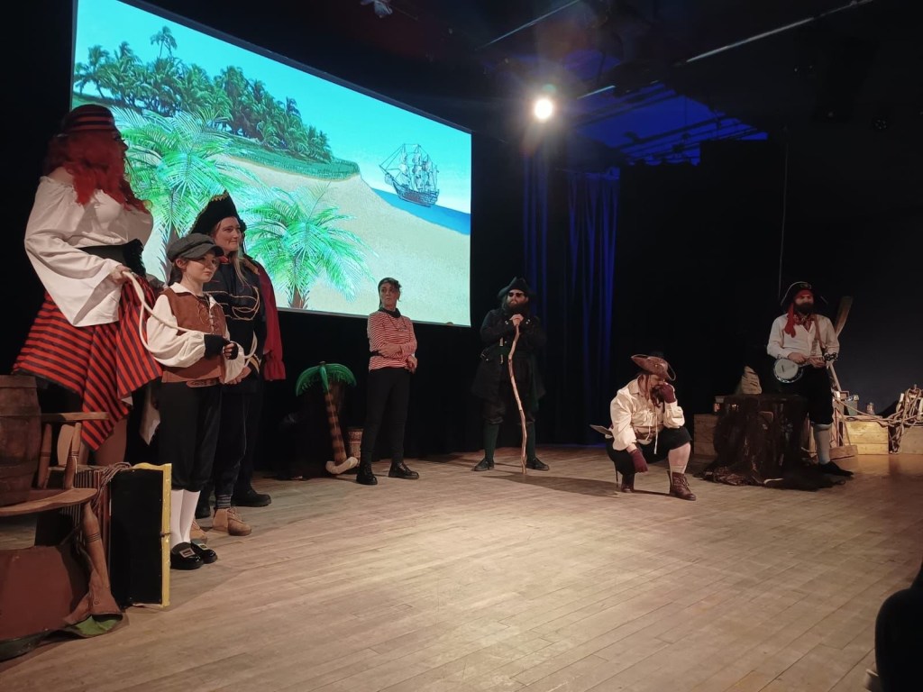 The set jokes were straight out of a cracker, but in addition writer and director Luc Valvona created some wonderful characters to move the story along. Ollie Fry – on top form as wannabee buccaneer Pirate Pete – held the whole thing together with his vast experience of performance and brilliant ability to get the audience on side. Martin Osborne’s PC Verald, a German officer dressed in black and red, bossing the pirates about, was the straight man we needed to balance out the mayhem. But it was the Master Detective Ben Gunn – played with aplomb by Victorian Rapper Baron Fortitude – who stole the show in the second Act. Having been marooned on the island many years earlier, with only his associate Perriworth (comparisons with a gentleman’s Willson from ‘Castaway’) Ben Gunn utilised his superior detective skills to save the day. And everything was resolved, with all the pirates planning to return to the harbour to spend their treasure winnings on the streets of Newport before Christmas.