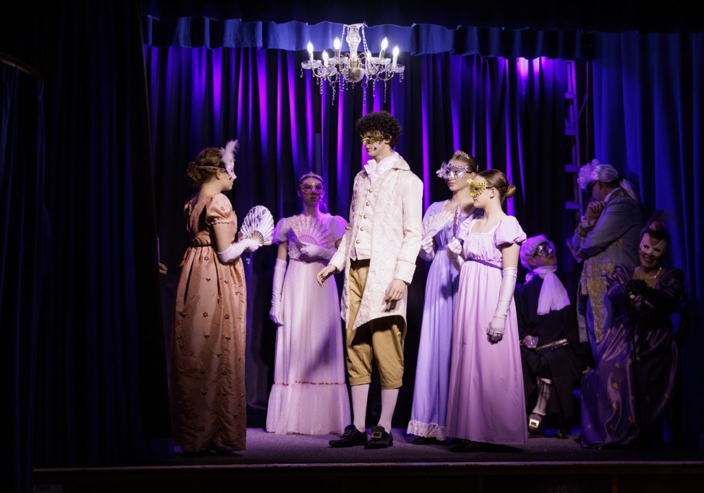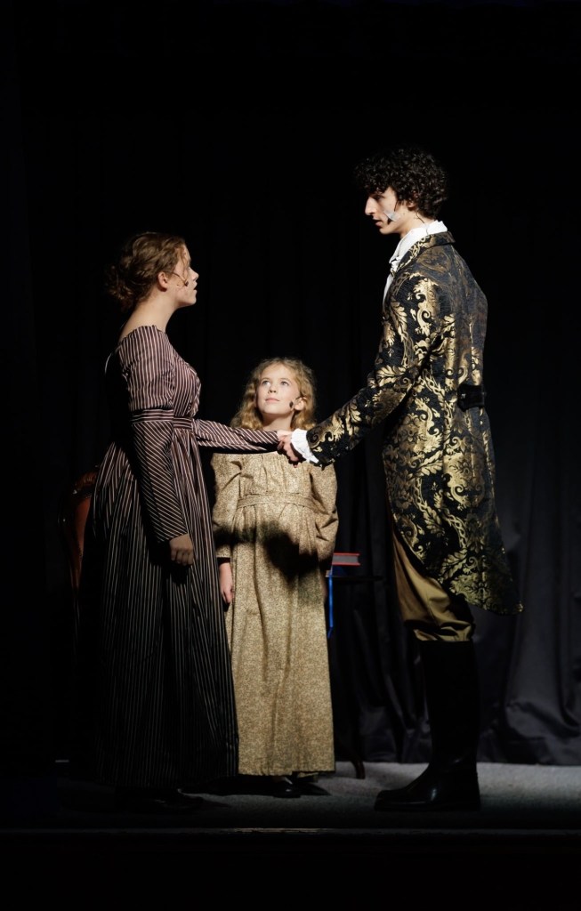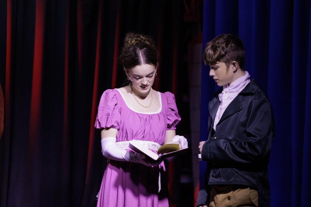 There were also many even younger actors worthy of note. Noah Walker-Green was hilariously hideous as the obnoxious Sebastian Worthington, heir to the Fitzherbert estate, a role he combined with that of Rev Stewart’s eldest son Thomas. Emily Evans was demure as Edmund’s sister Sofia, the apparent object of Sebastian’s interest. The Stewart family also included Polly Careless and Maisie Walker-Green in a cheeky double act as Amy and Alice: their commentary about the amours of their elders added to the humour – I could see these two growing up to be Kitty and Lydia Bennett if they’re not careful! Both girls also portrayed young versions of the main characters with humour and empathy respectively. Freddie Nixon completed the Stewart family as Barnaby and again appeared as a young Nicholas, while Ozzy Cornes, Alannah Griffiths and Gertie Nixon all supported in double (at least) roles: all showing a maturity on stage beyond their years.