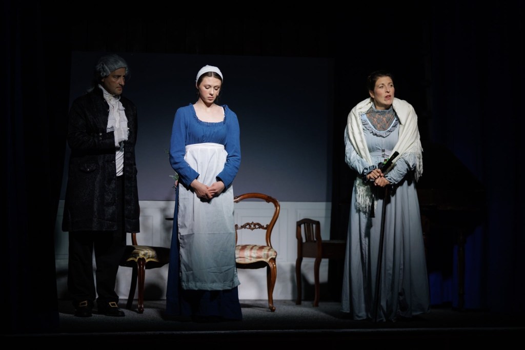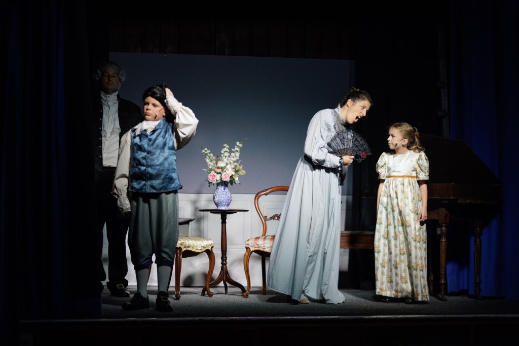 A bit of me would like to see the Niton Playbox in a larger theatre space so more can enjoy their shows – yet their home in Niton Village Hall gives a lovely intimate, family atmosphere – along, it has to be said, with many challenges for the backstage team…what do I mean team? Having seen the backstage area, there’s no room for a team! Jayne Hill ably stage manages along with taking a supporting role as the kindly housekeeper, Mrs Bevan. Jody Berry supports her with costume changes – mention must be made here of the lovely Regency costumes, including accessories – and I’m guessing it’s all hands on deck for the cast to do scene changes – yet every change is slick, the pace kept up, and full use made of the front of stage area. Many larger-scale productions could use a lesson or two on stage management from this group. Sound and lighting too work well to complement the acting: every word is clear and every face seen.