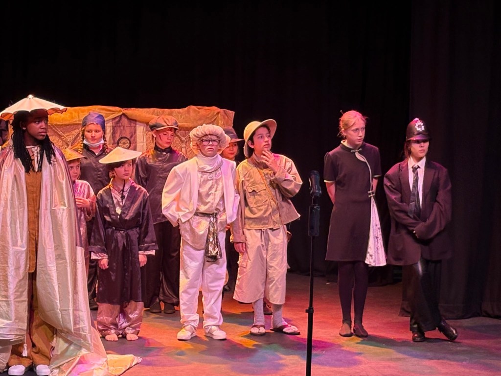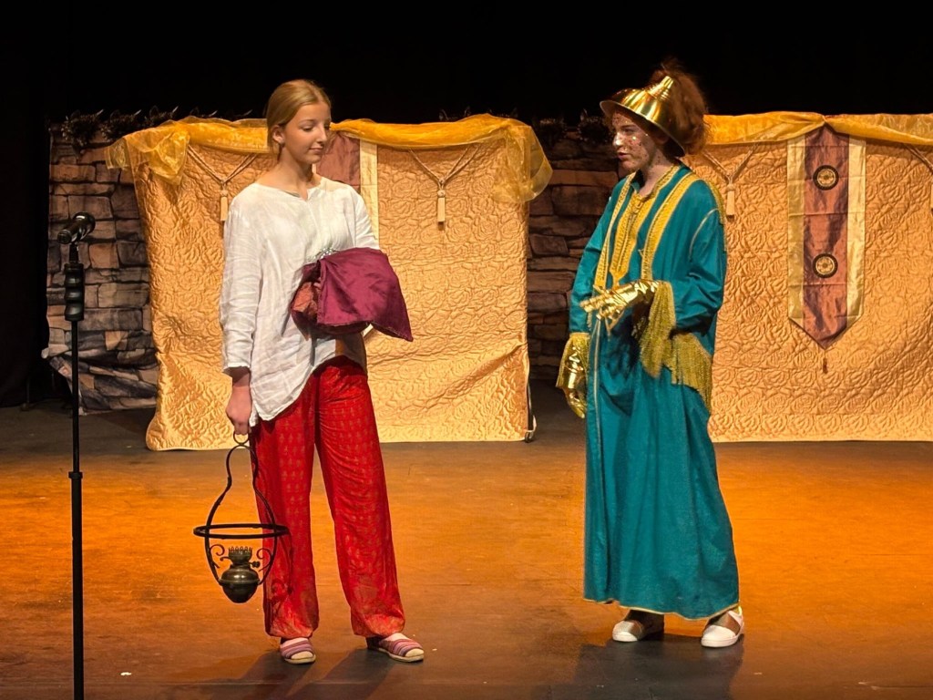 Fun and laughter went hand in hand, with narrators Pip and Huxley adeptly and comedically narrating the tale of poor Aladdin and his quest for the rich Princess Lotus. Aladdin, played by Tilly was confident, clear, and kept the pace up, including leading with confidence the many chase sequences, ably pursued by PCs Plod and Percy played by Ann and Joe. The traditional baddie, gaining plenty of boo’s and wowing with their rendition of Queen’s ‘Don’t Stop Me Now’ was Eliza as Abanazar. She commanded the stage, being completely believable as the power-hungry despot, willing to go to any lengths to gain the lamp and its resident genie (Delphi). The lovely princess (Ruby) was graceful and smart, with a lovely singing voice; and she shared great comic timing with her ‘handmaidens’ – Left Hand, Red Right, Mean Back Hand, Hani-Sani and Jazz Hands: special mention goes to Amelia as Jazz Hands for stopping the show each time she performed her signature move!