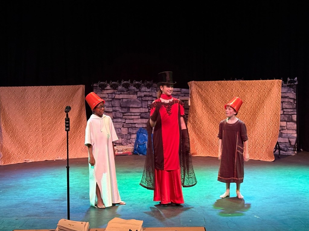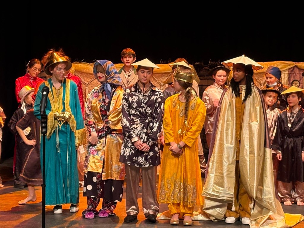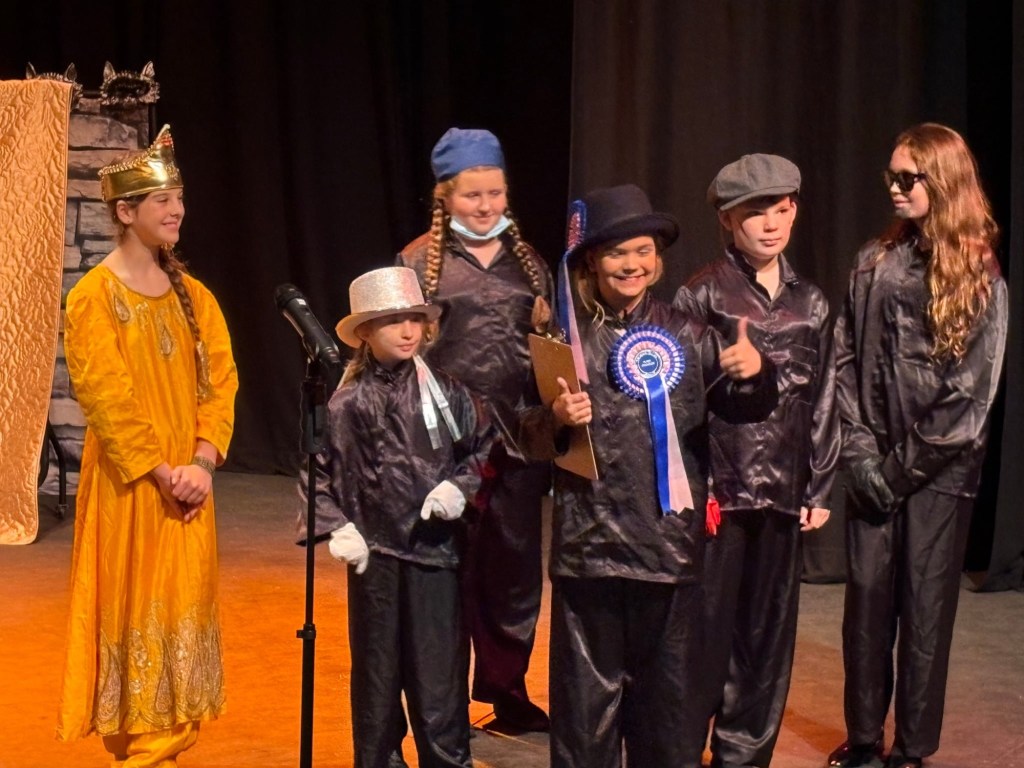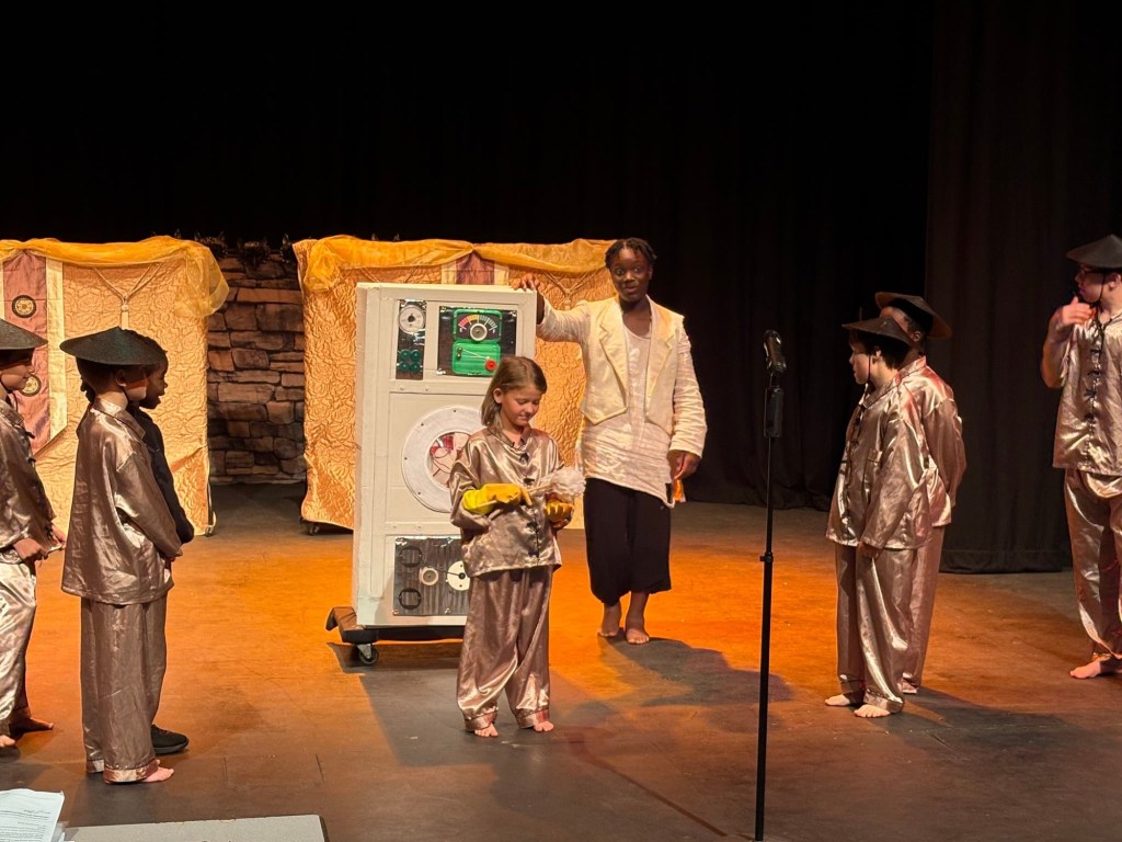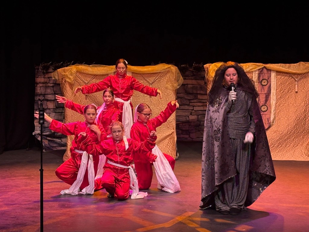 Also providing solid humorous passages were Aladdin’s brother Wishee Washee, who cleverly improvised with style to cover a late cast entrance; and their mother Widow Twankee – played very well at short notice by Summer with no rehearsal time at all. Sadly, sickness had taken its toll on the cast and whilst we sadly had to miss the performance of Amber, Summer really stepped up, from backstage to main part in one afternoon! Another late cast change was not noticed by the luminous performances of Ted and Samuel who combined their henchmen roles as Pick and Mix with energetic and chaotic action whilst juggling errant fez hats. The Emperor (Violet) is one to watch – she had a splendid regal bearing and showed great potential with her natural handling of the dialogue. Strong performances were also given by the Emperor’s courtiers Too Shy Shy (Ben) and Hush Hush (Theo), with adults of a certain age sniggering nostalgically at the Kajagoogoo joke. The Spirit of the Ring (Ophelia) also drove the plot forward, with well presented dialogue and a confidently performed solo song.