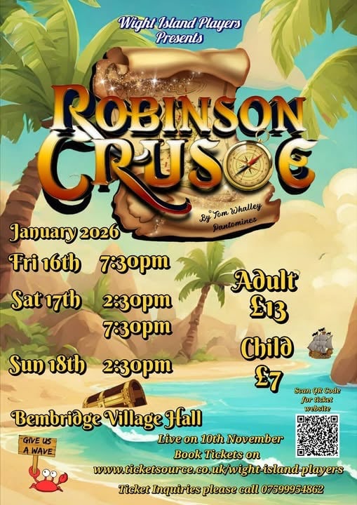All aboard ye landlubbers for this year’s nautical pantomime from the Wight Island Players! Yes – Robinson Crusoe is coming to Bembridge Village Hall from 16th – 18th January, and tickets are on sale now.