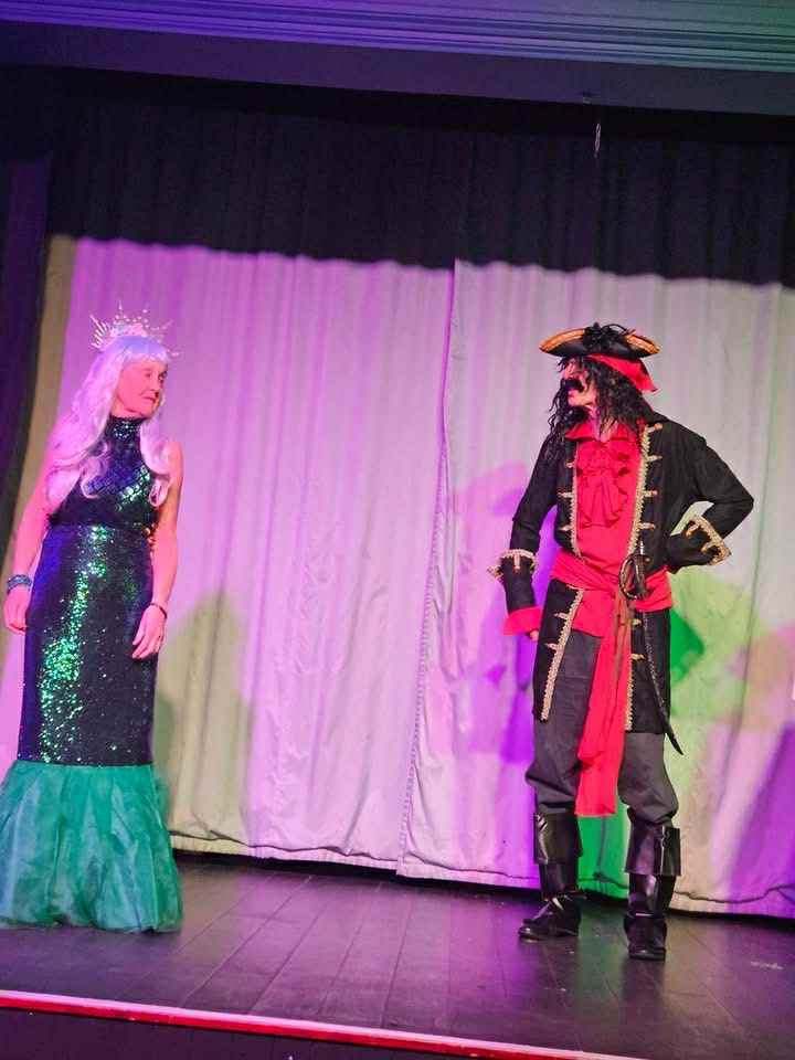 Having time to glance through the programme, the production is clearly a team effort with people taking on multiple roles led by Anna Shiner at the helm as Director and Producer. There was a real sense of community spirit in the hall as the audience heartily greeted the sparkly Calypso -The Spirit of The Seven Seas. Heather Austin plays this magical character and proves to be a powerful ‘Fairy Godmother-esque’ for our title role Robinson Crusoe.