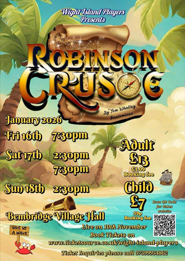 It was time to climb aboard the good old SS Pantomime and join the Wight Island Players for a joke-filled, family- friendly show, Robinson Crusoe! Packing an eager audience into the well-appointed Bembridge Village Hall myself and the rest of the W-G family waited to be entertained with some jolly good fun and thankfully we were not disappointed. What followed was a tightly run panto ‘ship’ full of all the trimmings and essentials that you would expect! Well done Wight Island players!