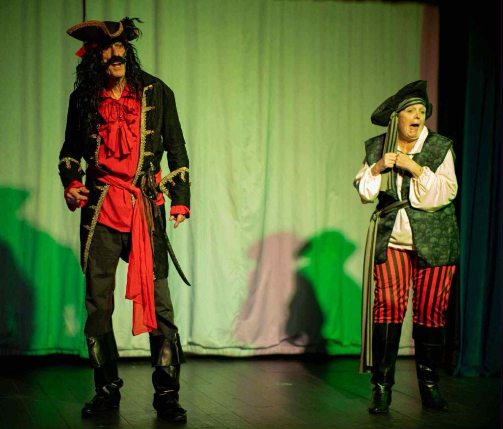 As there are another three performances of this show we will not give away any plot spoilers but the show is based around the exploits of the Crusoe family and their adventure to a treasure island. They are pursued at every turn by the fearsome Blacktashe (John Poerscout-Edgerton) and the hapless but lovable Winkle – Lynda Rogers. The motivating force in the Crusoe family is the formidable Dame Crystal – Chris Stroud. Chris is a cheery dame who commands the stage and bounces off the other characters whilst driving the scenes forward with good solid comic timing. Her worn down husband Captain Crusoe (Keith Partington) provides a good foil to the silliness on stage, whilst cracking a few well measured jokes himself.